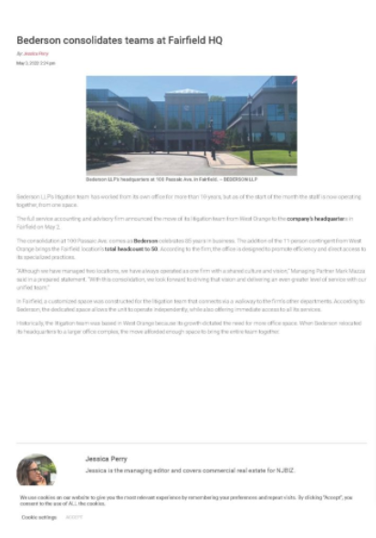Bederson’s WO relocation featured in May 3 edition of NJBIZ: Bederson Consolidates teams at Fairfield HQ